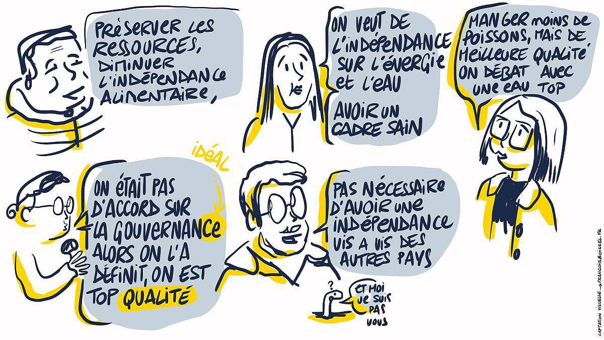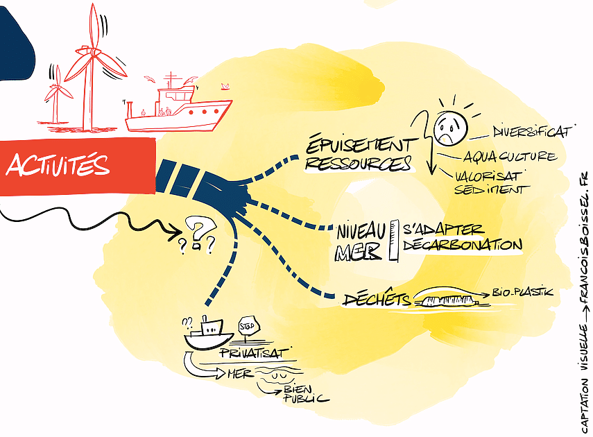 La mer a été désignée comme étant “un bien commun”, laissant la parole aux avis et valeurs des personnes en tant qu’individu·e et non professionnel·les : “Au début je parlais avec ma casquette de professionnelle et au fur et à mesure de l’atelier, je l’ai mise de côté et je parlais en tant que citoyenne”.
