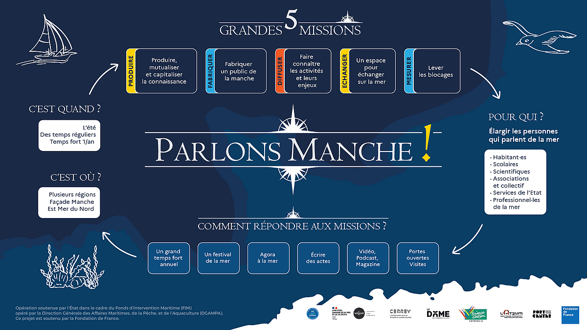 Créons ensemble un espace collectif d’échange et de réflexion pour aborder les enjeux maritimes de la façade Manche Est-Mer du Nord : après "Voyons large !", "Parlons Manche !". Ce projet vise à renouveler la manière dont on parle, pense, décide et agit pour la mer en impliquant les scientifiques, administrations, professionnel·le·s, associations, scolaires et habitant·e·s du territoire dans la co-création du territoire maritime de la mer de la Manche.
