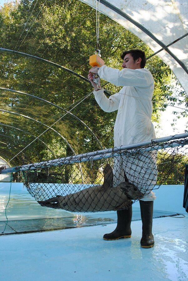 Les traitements sont adaptés en fonction des besoins de chaque individu : poids, pathologies, déshydratation... Un régime spécifique est également prescrit à ces jeunes souvent très affaiblis. Une fois que l'état général d'un spécimen s'est amélioré, un placement en bassin extérieur peut être fait. A partir de ce moment, le jeune sera observé très régulièrement par les deux bénévoles désignés pour s'occuper des phoques, pesé une fois par semaine, et reçoit une boucle d'identification. L'évolution de la courbe de poids est un indicateur important de la santé d'un jeune phoque, en pleine croissance. Au cours de l'élevage, les bénévoles leur apprendront à se nourrir seuls : un protocole d'apprentissage long et rigoureux, consistant à apprendre aux jeunes à manger du poisson en entier, à ouvrir la gueule sous l'eau pour l'attraper, et enfin, à aller le chercher seul dans l'eau.
