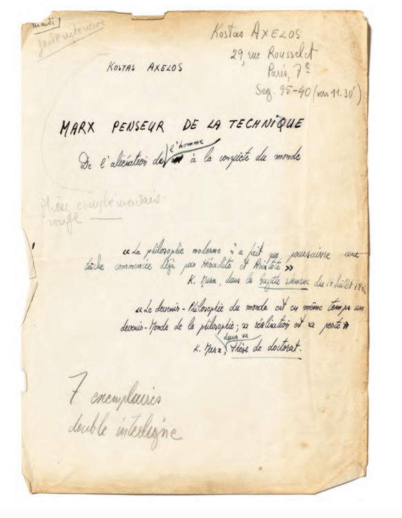 Image Kostas Axelos. Manuscrit de sa thèse, « Marx penseur de la technique », s. d. (Paris, Minuit, 1961). Archives Kostas Axelos/Imec.