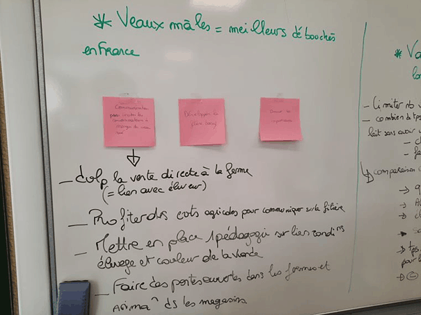 Suite à ce temps d’introduction, nous avons lancé les étudiantes dans la phase créative en leur proposant un petit exercice de réflexion, sur le modèle « Pour le bien-être des veaux, ce serait génial si… ». Très inspirées, les étudiantes ont proposé 40 idées. Après un vote et des discussions, 3 idées ont été retenues : « Ce serait génial, si … »