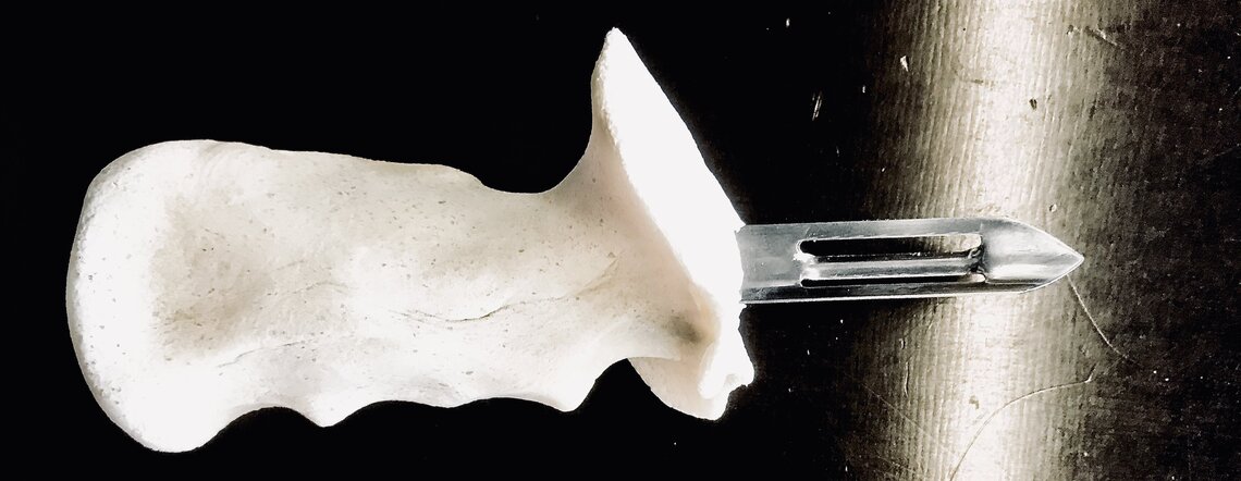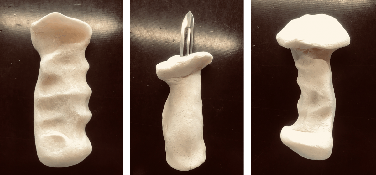 - tester différentes formes pour la cavité du manche adapté destinée à accueillir le manche standard de l’économe afin de pouvoir le retirer plus facilement tout en assurant un bon maintien lors de l’utilisation. Un travail avec un ergothérapeute serait un réel plus.