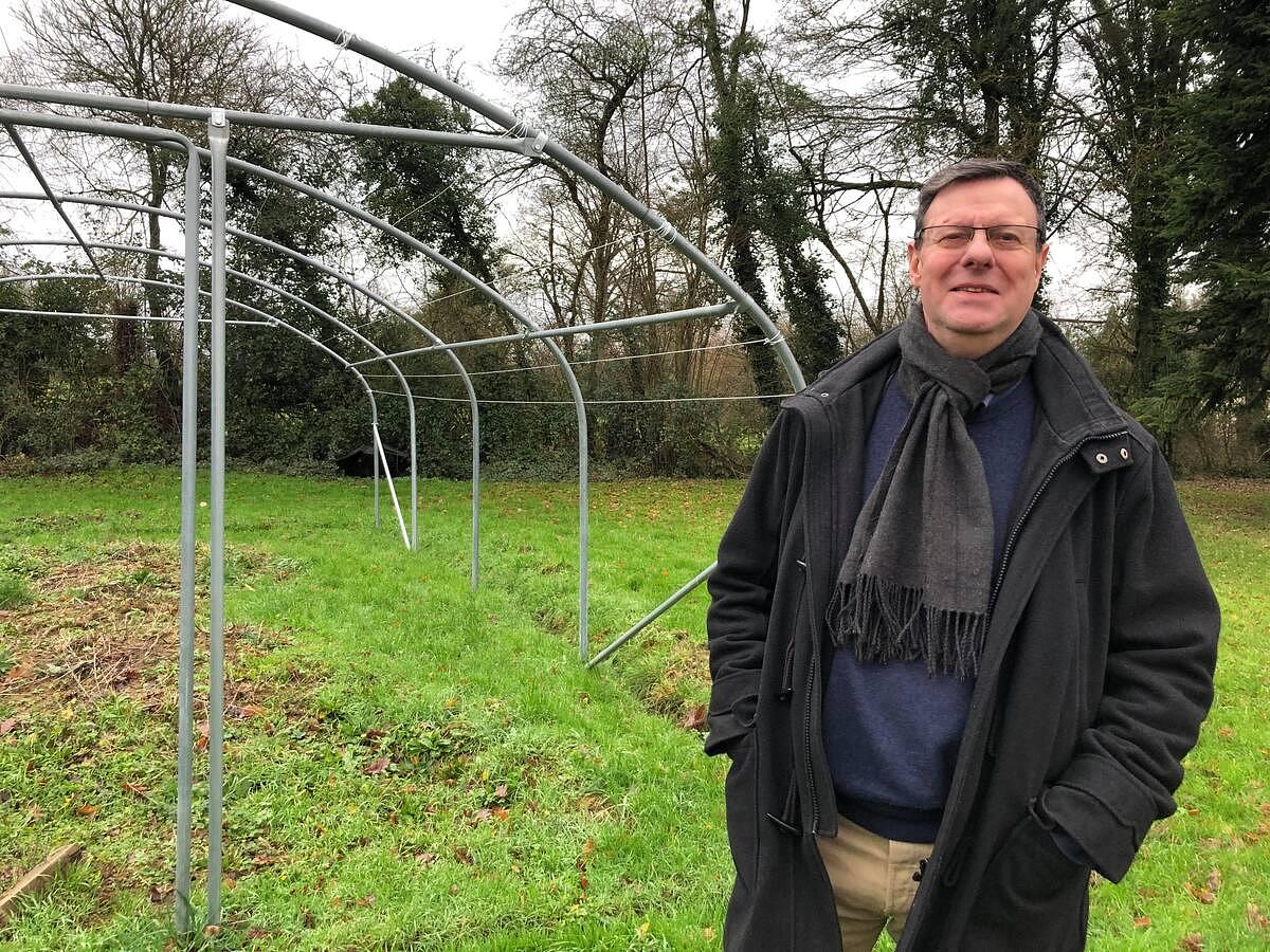 Xavier de Mazenod devant la serre en cours de construction qui deviendra le lieu d'accueil du robot potager FarmBot.