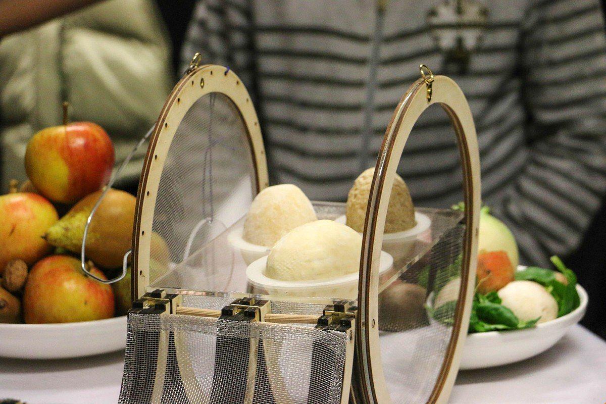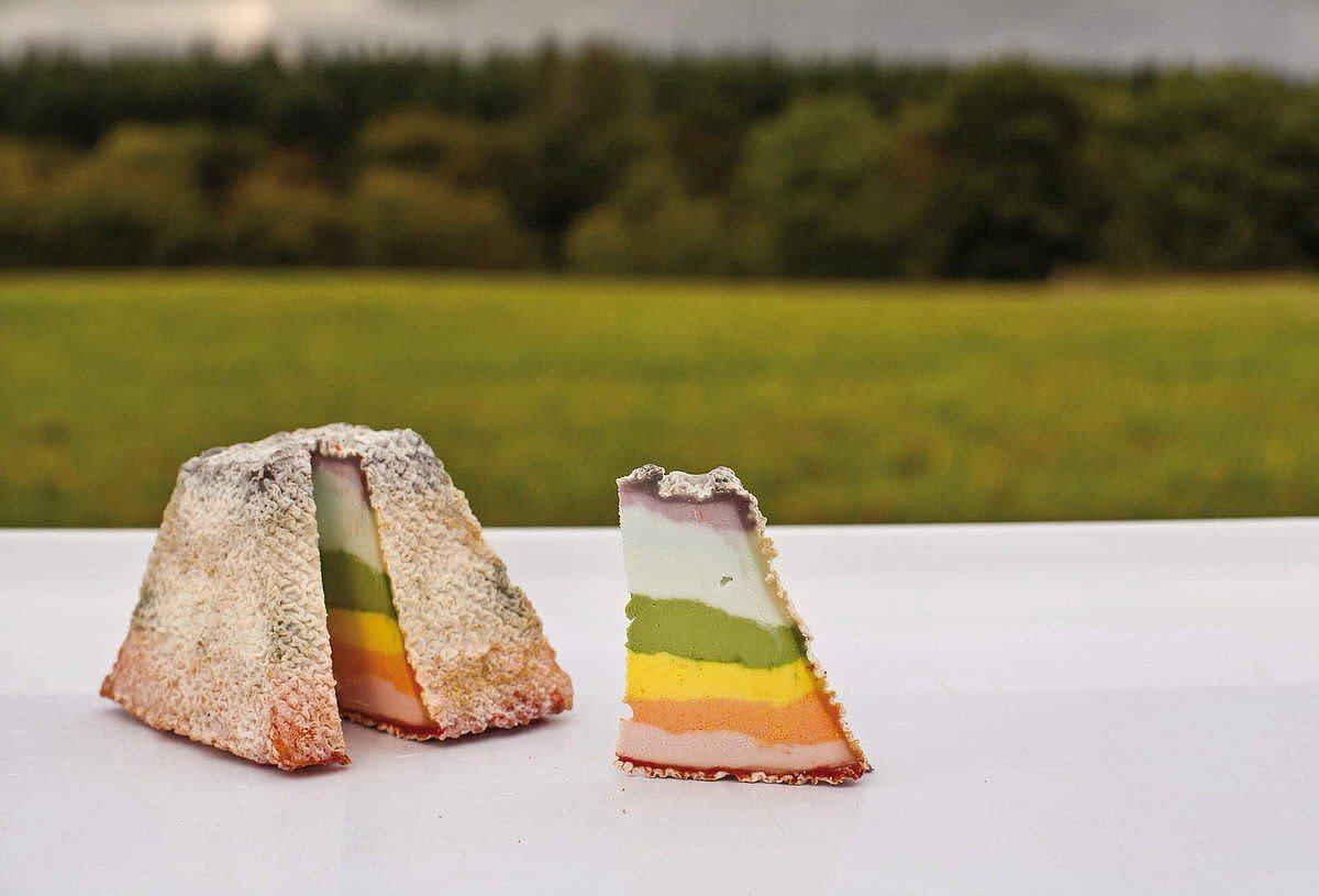 Après la fin de ma collaboration avec la Ferme culturelle du Bessin, j’ai repris mon travail sur la coloration des aliments. Il me manquait une couleur : le bleu. Je me suis donc lancée dans une série d’expériences culinaires et le bleu est arrivé avec des oeufs mimosas. Parallèlement, j’ai fait des recherches sur la symbolique des couleurs. Ce travail m’a amené à collaborer avec un artisan-fromager, Xavier Godmet, et nous avons créé “Les Vivres”, des fromages de chèvre constitués de 7 couches colorées. Xavier s’est ensuite associé avec un producteur de lait de vache et nous avons essayé d’insérer du fromage de chèvre dans du fromage de vache. Des oeufs mimosas, du lait de chèvre, du lait de vache, des couleurs… tous les ingrédients étaient réunis pour créer le premier fromage de poule !