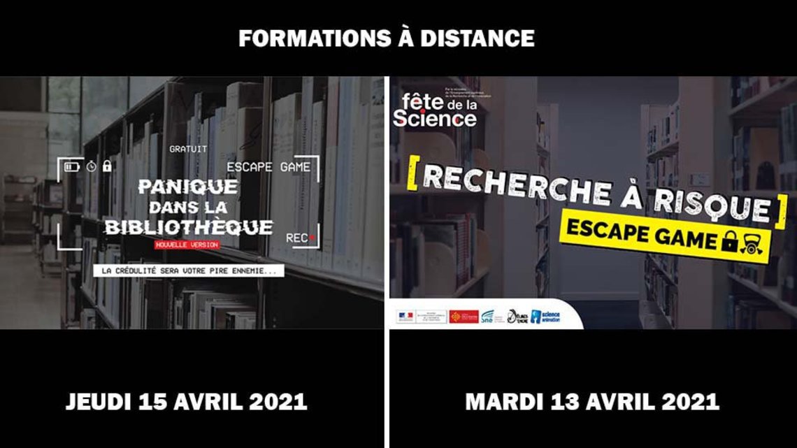 Dans le cadre du projet Sciences en médiathèque, Délires d'encre et l'association Sciences Animation proposent de nouvelles sessions de formations aux escape games Recherche à risque et Panique dans la bibliothèque en grands groupes en visio-conférence. Ces formations s'adressent aux professionnels des médiathèques, centres de documentation et autres acteurs de la culture afin de leur permettre de mieux s'approprier le contenu de ces escape games clés en main, de faciliter leur installation et de maîtriser la position de maître du jeu.