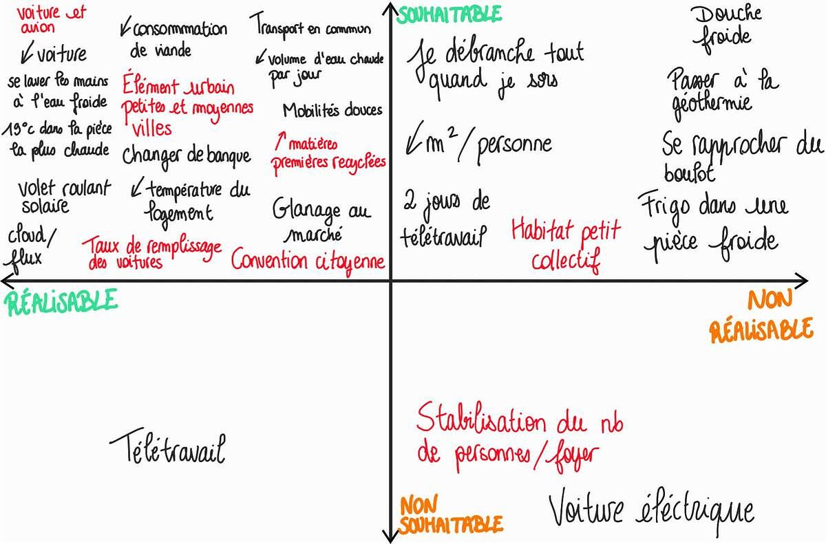 Si prendre des douches froides semble souhaitable mais pas réalisable, limiter collectivement l’usage de la voiture et de l’avion a été reconnu comme réalisable et souhaitable par les participants. Ces deux exemples montrent une première distinction entre les changements qui impliquent les comportements des individus (en noir sur la figure) et ceux qui nécessitent une transformation de l’organisation sociale (en rouge sur la figure). D’autres propositions relèvent d’une évolution des règles collectives : télétravail, ou d’une mutation des valeurs sociales : cohabitation.