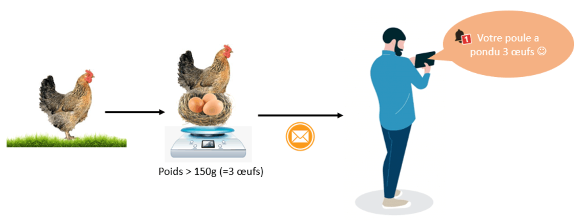 Lors de notre premier atelier, la création d'un poulailler connecté a été retenu par les deux équipes participantes. Parmi les différentes propositions à intégrer dans ce poulailler, une d'entre elle a retenu notre attention. Nous avons choisi l'idée d'une balance qui enverrait une notification à l'habitant lorsque sa poule a pondu 3 œufs, comme expliqué sur le schéma ci-dessus.