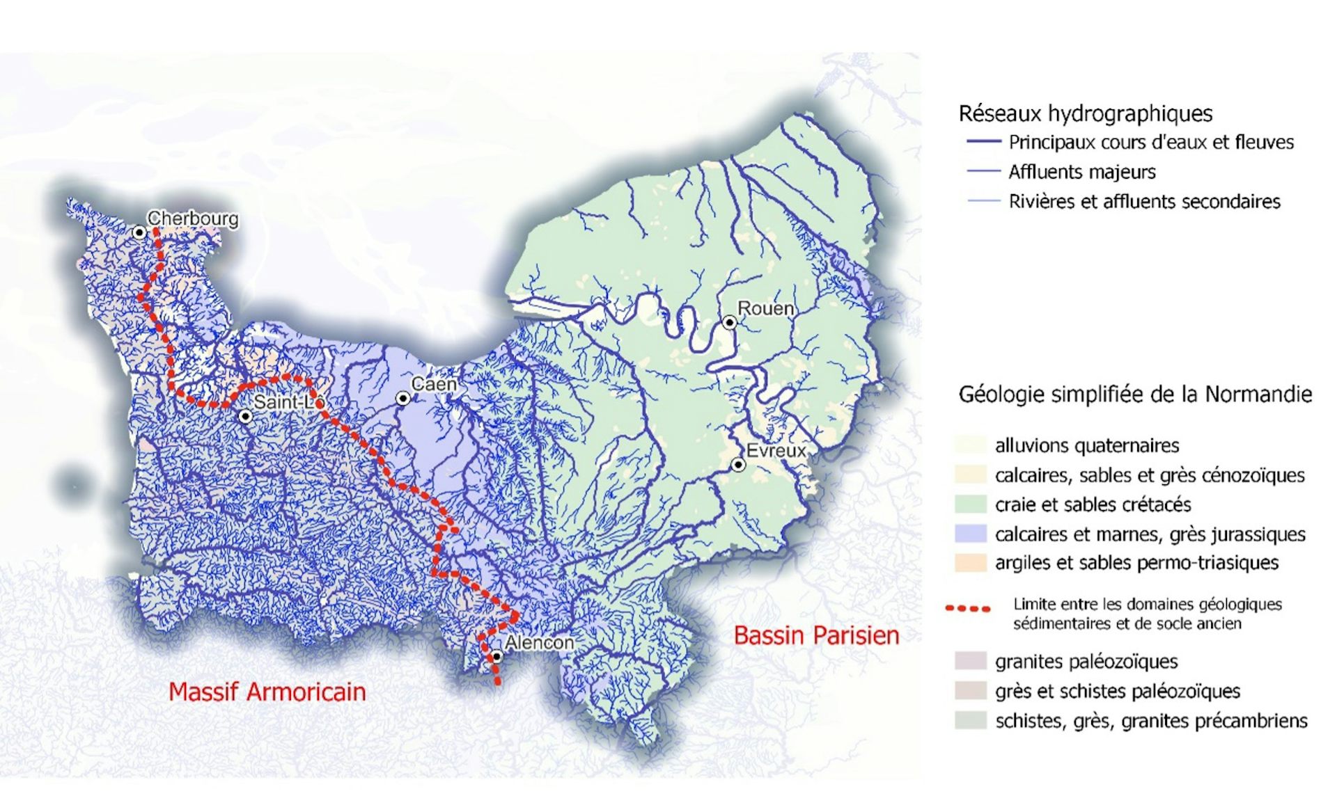 Ces différences affectent les capacités du sous-sol à retenir l’eau. Ainsi les terrains calcaires du domaine sédimentaire (partie Est) ont tendance à laisser s’infiltrer l’eau de pluie dans le sous-sol. Au contraire, les terrains de socle (partie ouest), moins perméables, ont plutôt tendance à laisser l’eau de pluie ruisseler à la surface du sol. Il en résulte un réseau de rivières très dense en domaine de socle (partie ouest) et un chevelu hydrographique beaucoup moins développé sur les terrains sédimentaires calcaires de la partie Est.