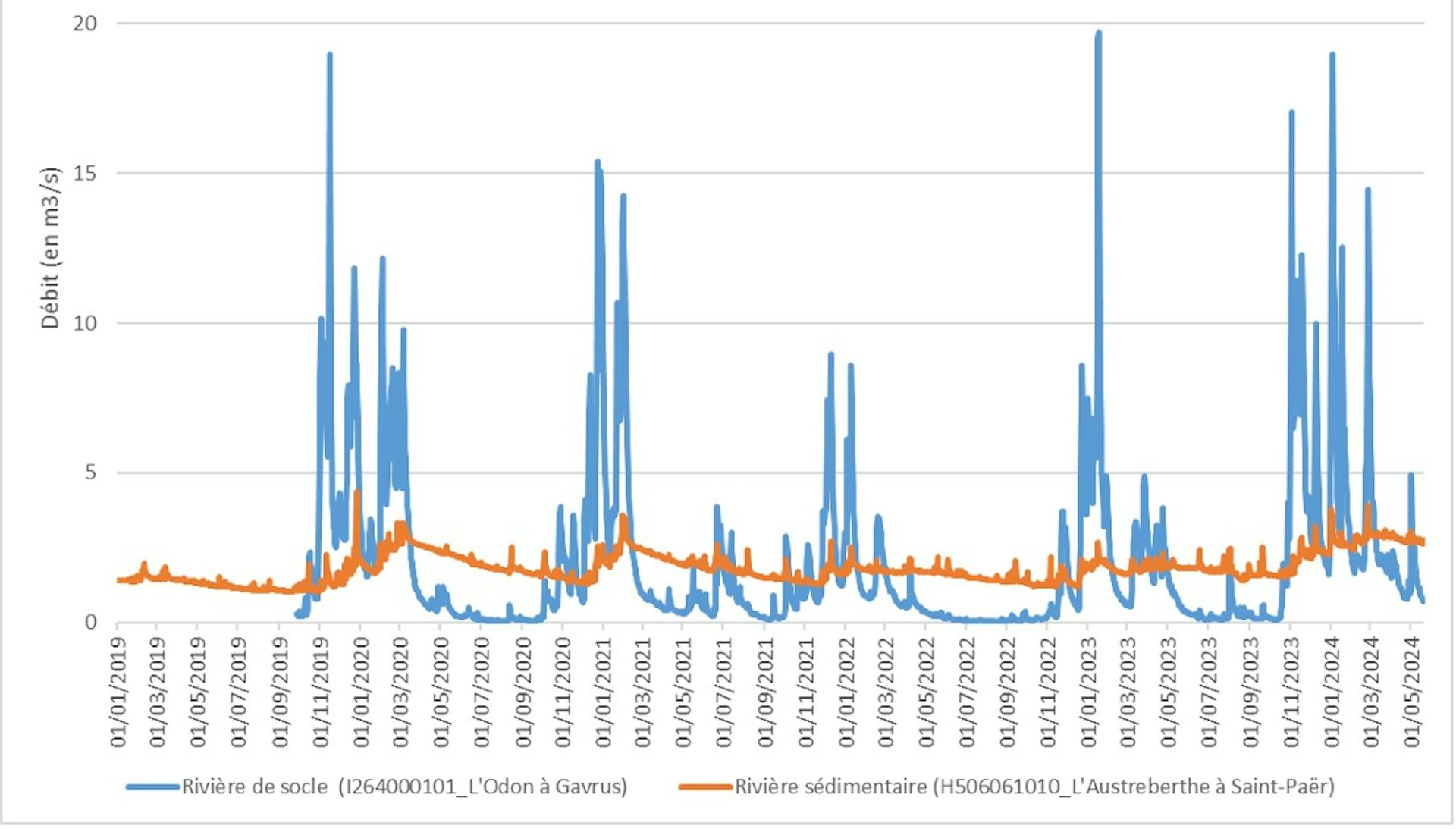 L’est de la Normandie aussi a été touché, quoique la mécanique soit différente : c’est la succession d’épisodes de sécheresse hivernales qui a conduit à une moindre disponibilité des ressources en eau souterraines pour soutenir les débits des cours d’eau en 2017, 2019 et 2023.