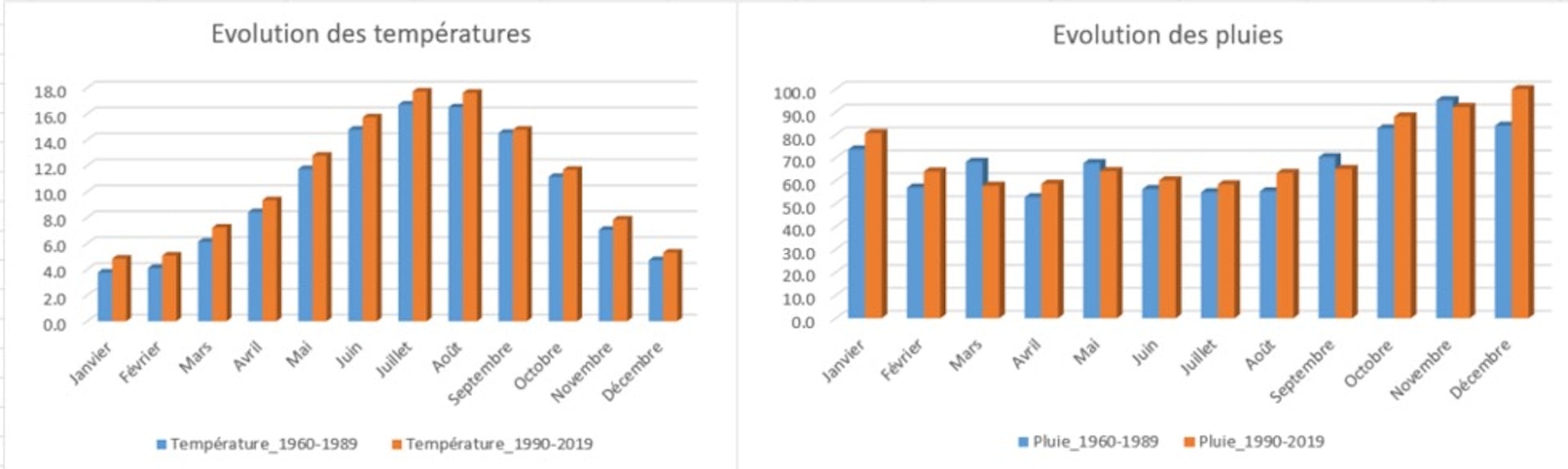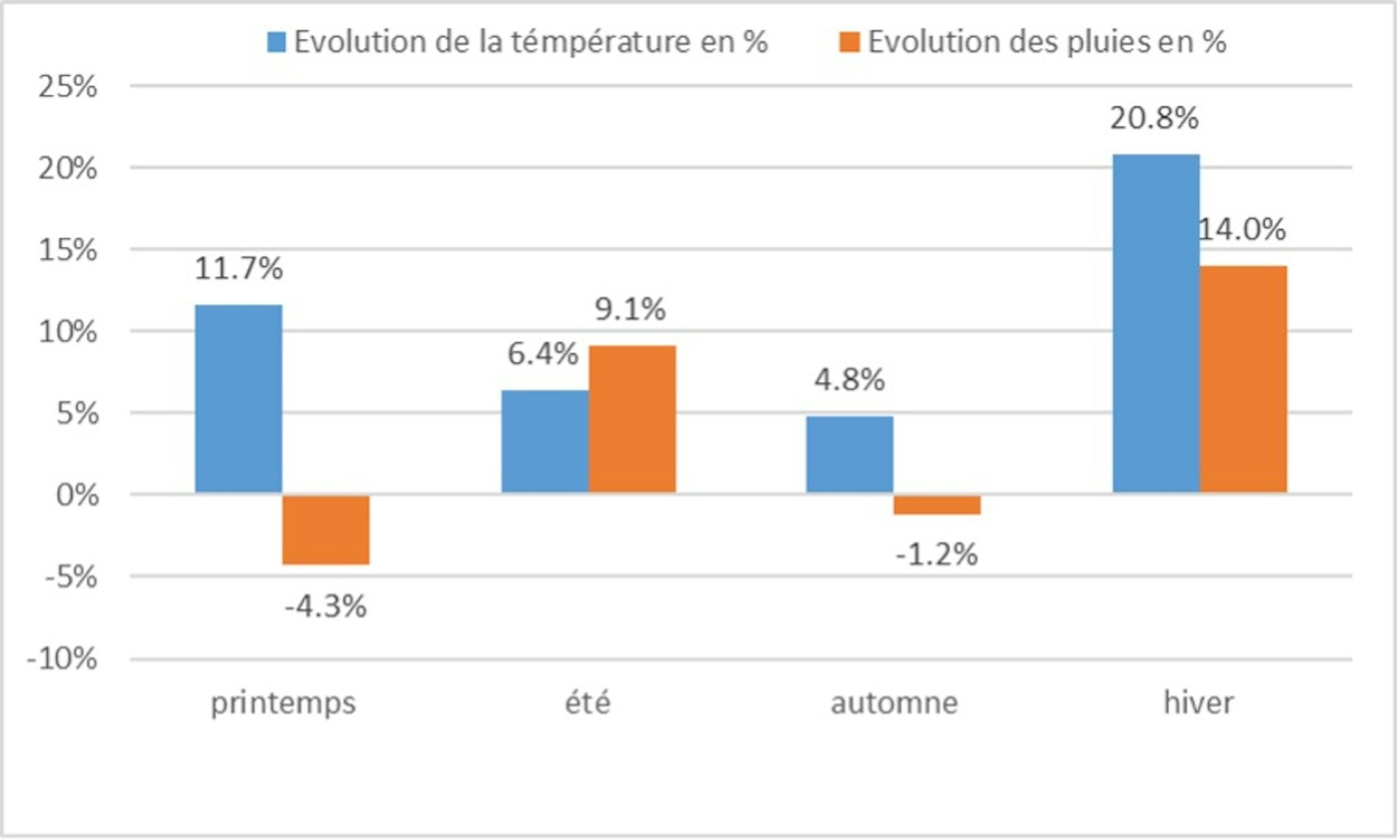 Ils montrent également des changements saisonniers dans les précipitations avec, en moyenne, des hivers et étés plus humides (respectivement +14 % et +9,1 %) et des printemps et automnes plus secs (respectivement -4,3 % et -1,2 %).