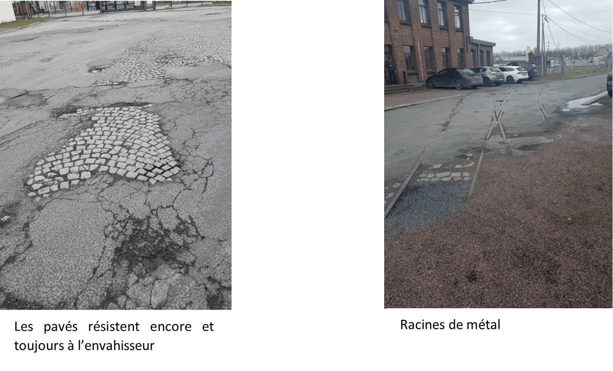 Une succession de couches historiques est visible au sens propre sur le sol : les pavés sont recouverts partiellement de béton, les rails enfouis refont parfois surface et la végétation tente de reconquérir le gris des murs et des rues. Les couleurs témoignent elles-aussi de l’histoire du lieu : si le gris et le marron dominent très largement le paysage, des touches de couleurs primaires vives viennent régulièrement marquer les rares passants. Ce sont des couleurs primaires (rouge, jaune et bleu) dont les nuances rappellent le monde des chantiers et des usines : jaune signalisation, rouille, vert de gris, bleu de travail, etc…