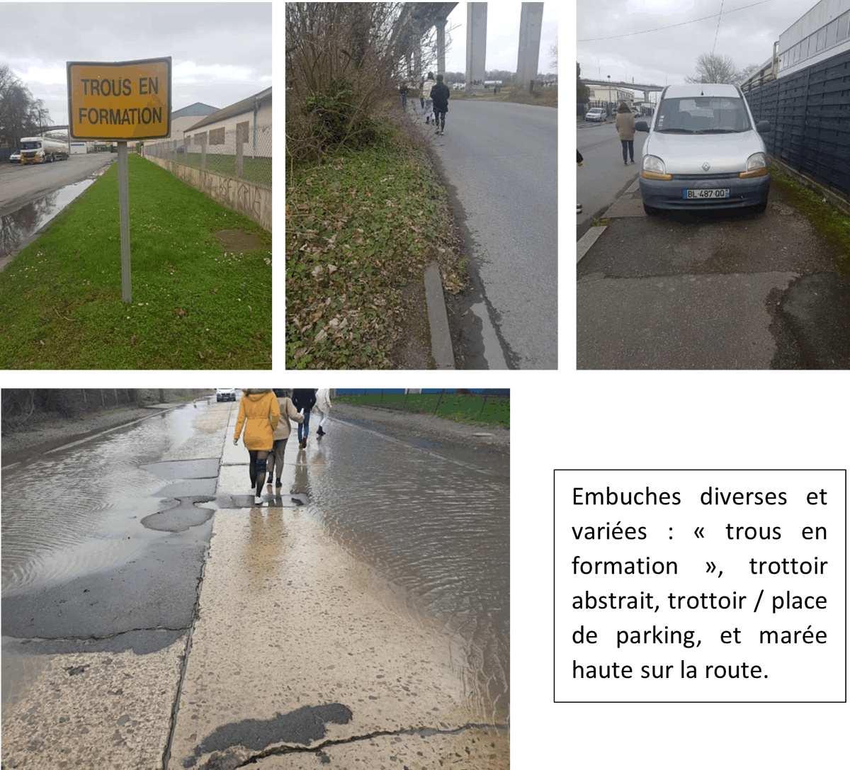 Cette dernière n’a pas été une promenade de santé, en raison de l’absence de trottoir, des immenses flaques qui stagnaient sur les routes, des chemins parfois barrés, des barrières présentes sur les quais ou de la vitesse des automobilistes clairement peu habitués à croiser des piétons sur leurs itinéraires.