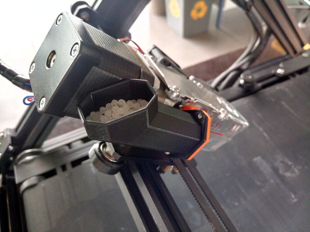Fin avril j'ai bien progressé sur la modification de mon imprimante à tapis roulant. J'ai pu remplacer la tête d'origine par un module qui utilise du plastique non pas sous forme de filament mais de granulés. Cela va rendre possible l'impression 3D à base de plastique recyclé sur place (avec le fameux broyeur-gouvernail), et ça c'est ultra cool !