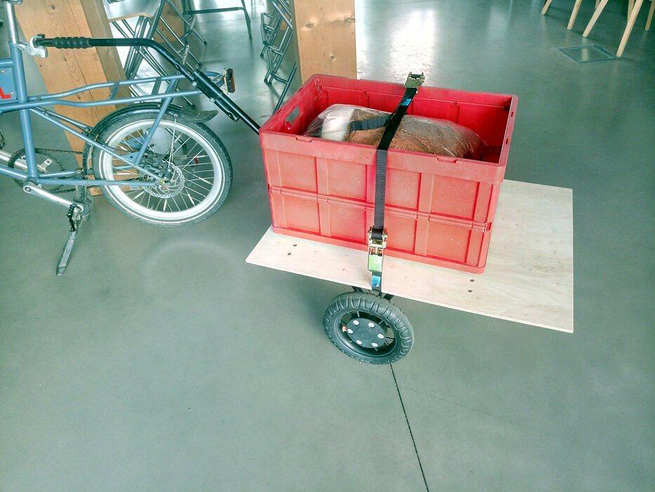 Une remorque trouvée en brocante, agrandie avec une planche, va me permettre d'aller chercher du bois pour l'atelier sans avoir à emprunter un véhicule. Un truc de moins à faire en voiture !