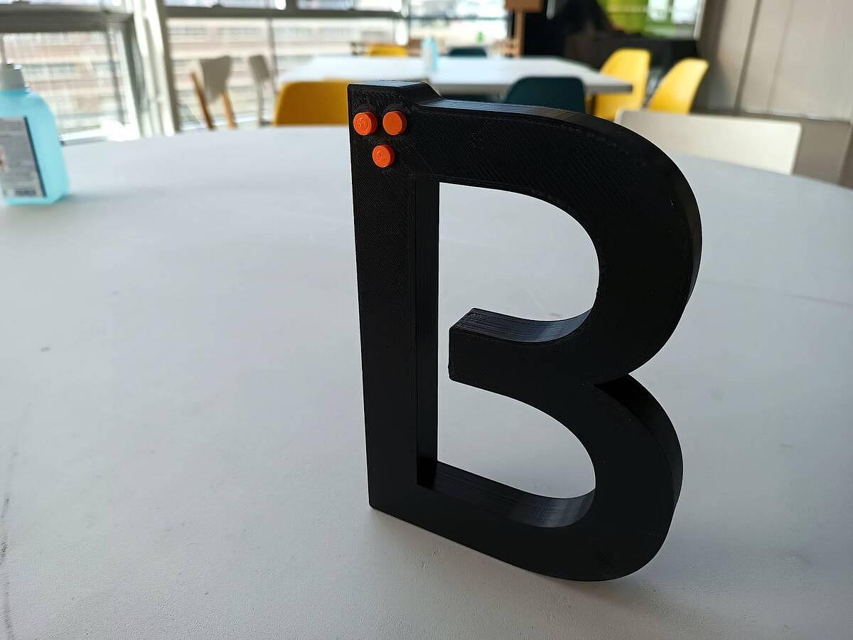 Pour un opticien du centre de Caen. Une grande lettre, dans laquelle sont incrustés trois cylindres oranges, le tout obtenu par impression 3D.