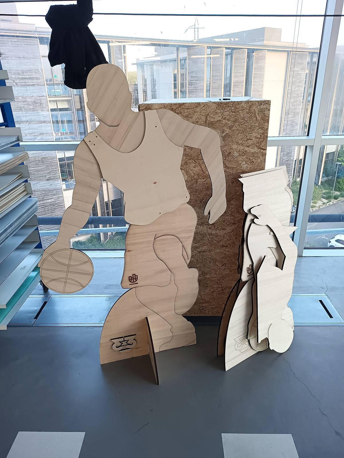 Une association organisait un événement sportif/caritatif, pour lequel des personnes sont venues fabriquer des obstacles et plusieurs mobiliers en bois pour une collecte de vêtements. L'astuce pour réaliser de si grands personnages avec la découpe laser (de surface utile "seulement" 100x60cm) : assembler des épaisseurs, la forme du maillot vient tenir et cacher (devant et derrière) la jonction entre les jambes et le torse et le bras gauche. La différence d'orientation du fil du bois ajoute même à l'impression de mouvement je trouve.