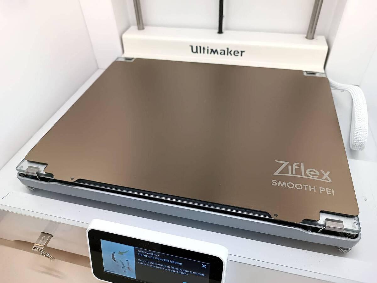 Pour faciliter l'utilisation de cette matière dans les imprimantes 3D, j'ai ajouté des plateaux en PEI à deux machines (une Ultimaker 2+ et une S5). Cela permet de ne plus avoir besoin d'ajouter de la colle à la surface en verre.