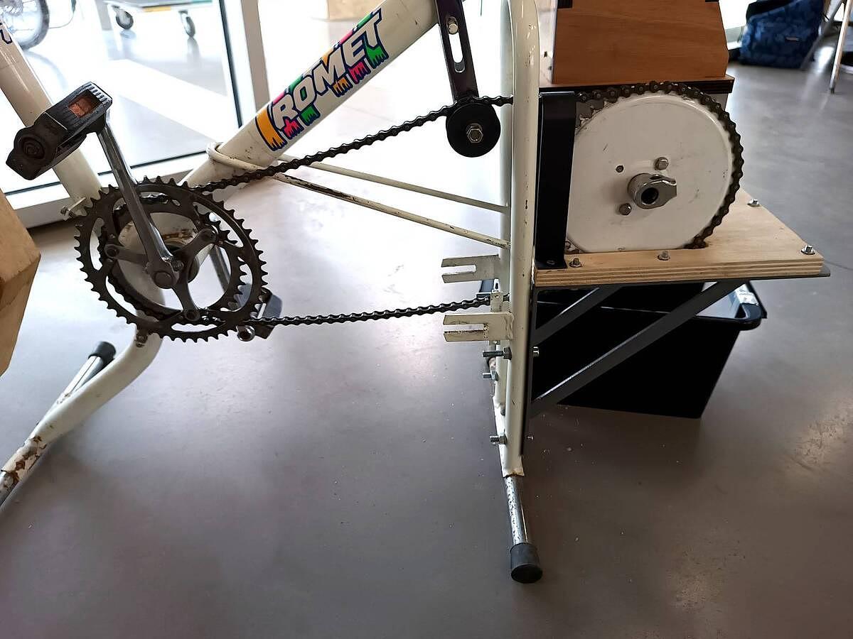 Installation d'un pédalier légèrement plus petit : la démultiplication nous donne environ 25% de force en plus, ce qui est toujours plus confortable.