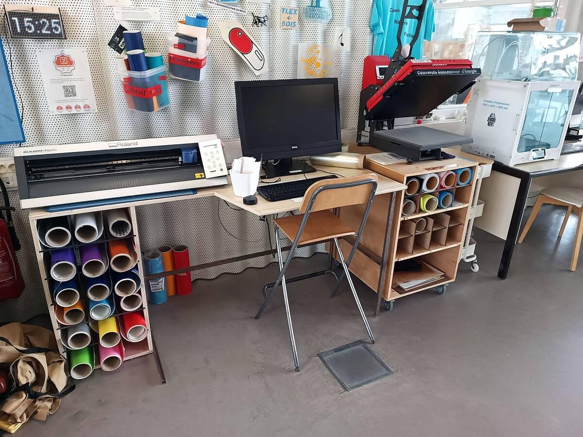 Ajout de rangements pour les rouleaux sous la découpe vinyle, la distinction avec ceux thermocollants sous la presse-chauffante devient plus évidente et libère de la place pour avoir plus de choix de couleurs (et le matériel pour le recyclage).