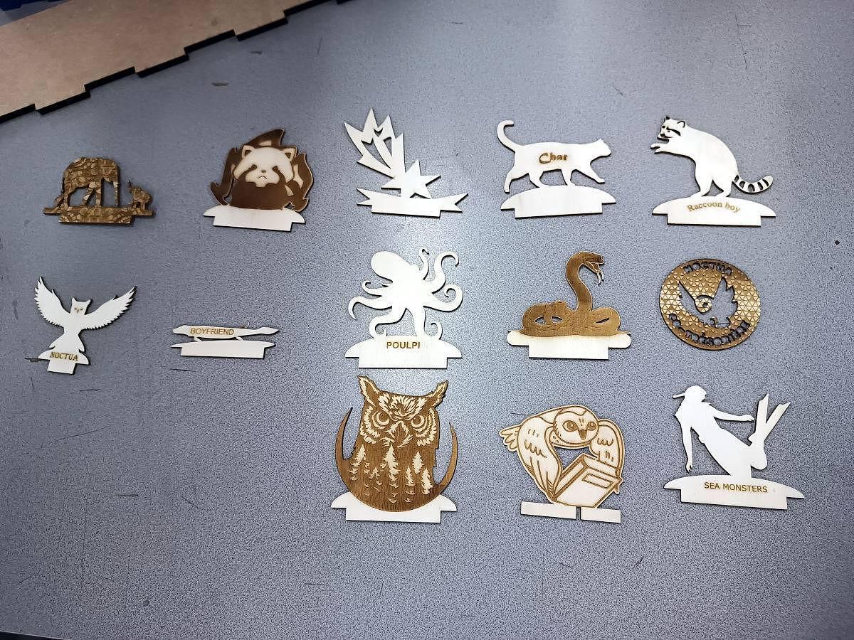 Pour initier en une demi-journée au dessin 2D avec Inkscape pour dessiner et à la découpe laser, l'exercice consiste à créer une sorte de petit totem. Ici la productions de la promo 2024-2026 de nos masters IMST.