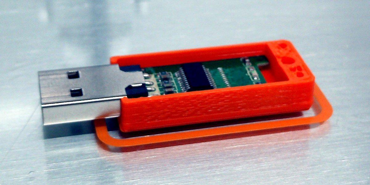 Dans la série des réparations : c'est l'histoire d'une petite clé parfaitement fonctionnelle mais dont le boitier en plastique avait fini par casser. L'impression 3D d'un bloc aux bonnes dimensions permet de la protéger à nouveau, elle y est même carrément incluse pendant la fabrication.