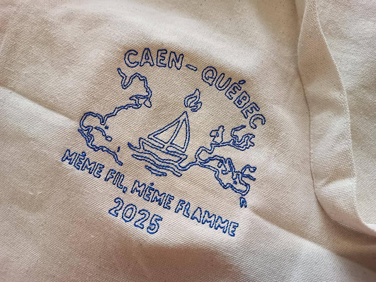 Il va rendre visite à des grands cousins du Canada ; et pour cela brode des sacs commémorant ce voyage (et en contour piqué c’est mieux qu’en aplat brodé).