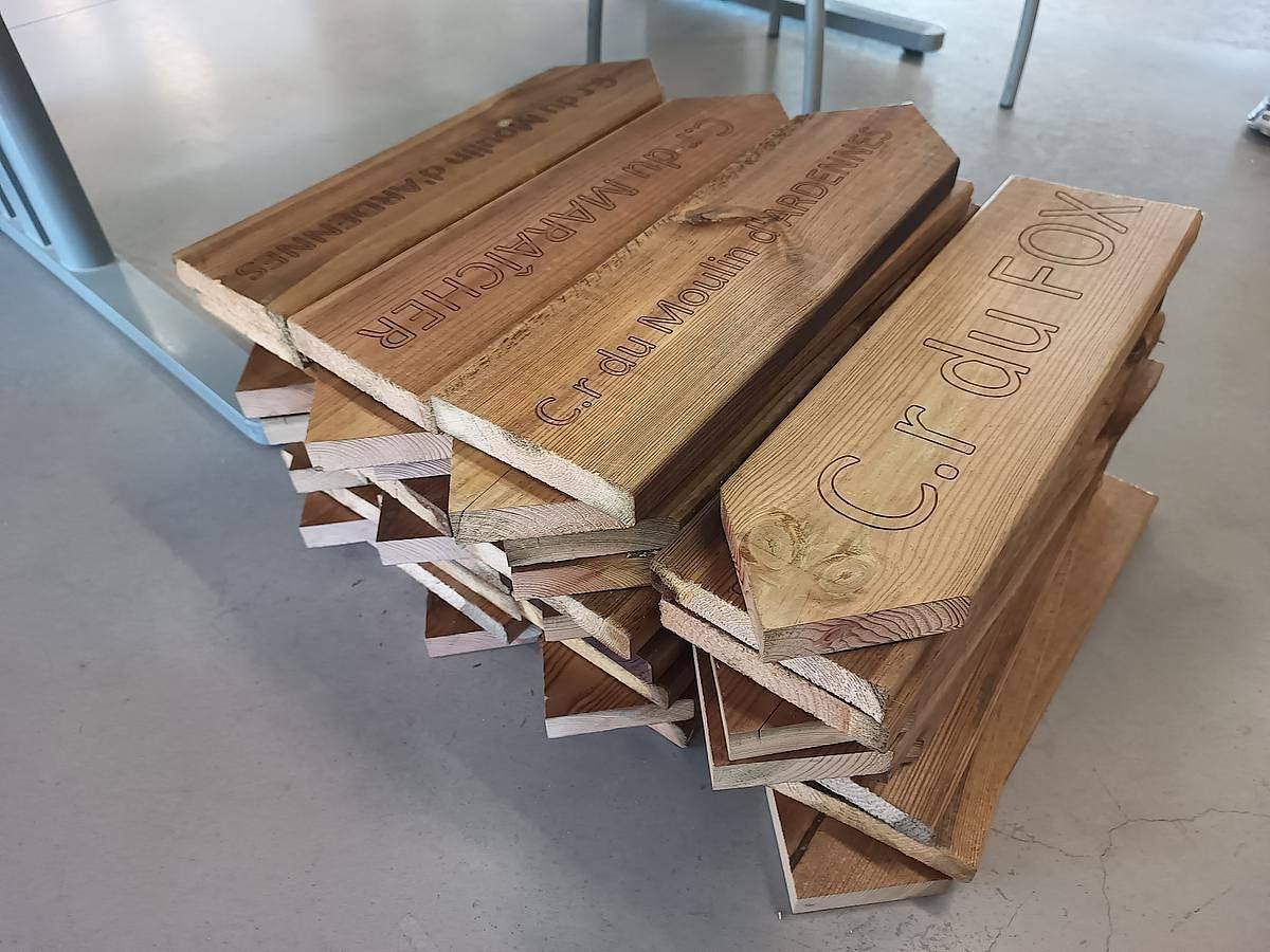 Avec son groupe de randonnée, ils se sont formé et sont revenus graver un gros paquet de flèches en bois qui vont indiquer les chemins qu’ils empruntent.
