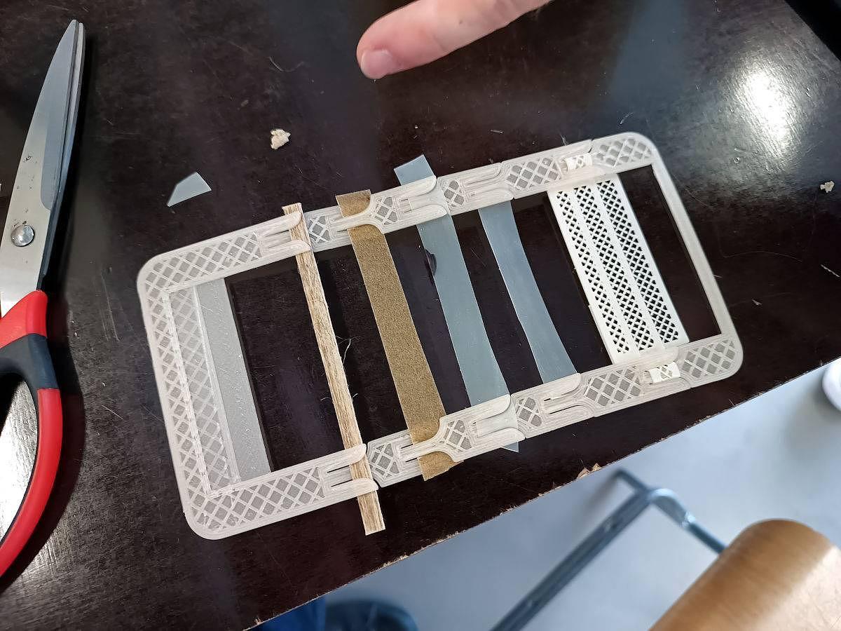 Le cadre est en PLA (ne devrait pas se dégrader), les bandelettes sont en PHA avec une proportion variable de fibre de lin. Si tout se passe bien les expériences démarreront quelque part en octobre.