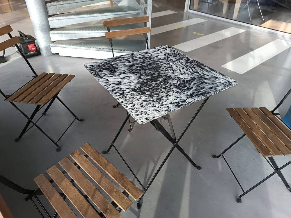 Ici le point commun serait d'avoir été réalisés par des groupes de bénévoles d'associations. Caen au Pied du Mur pour le pochoir de leur iconique pied, et Caen ça Swing pour les petites déco du stage de danse de juin. Dans ce deuxième exemple le "pochoir" ne sert qu'une fois : on coupe au laser le ruban de masquage sur la pièce à peindre, il va ainsi protéger le fond (on parle aussi de réserve) selon la forme qui nous intéresse. L'ajout de peinture offre une belle complémentarité à la découpe/gravure, certaines matières ne contrastant pas suffisamment, c'est aussi parfois plus efficace.