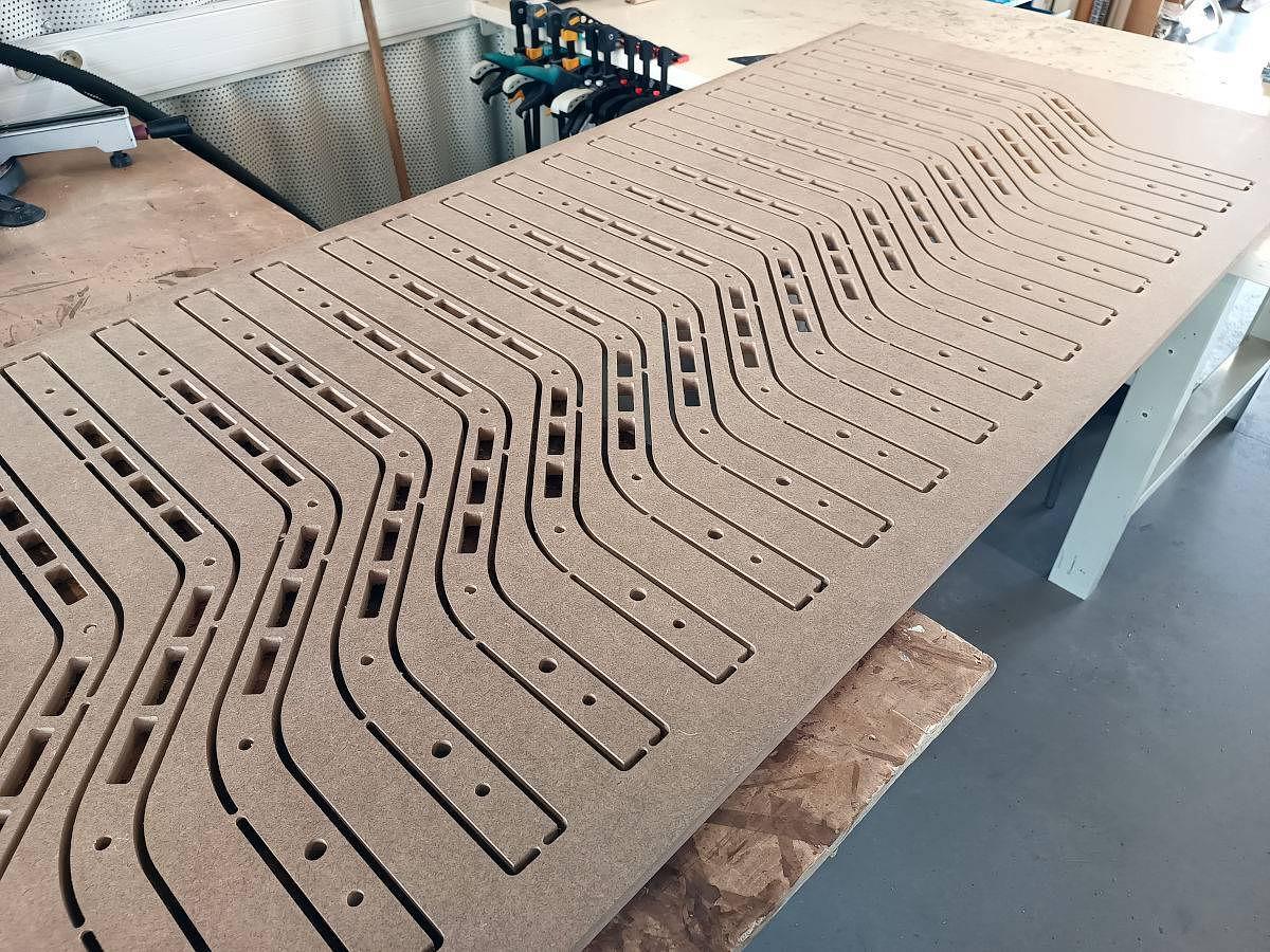 Un projet d'un artisan local qui occupa la grande fraiseuse une bonne partie du mois. Imaginez l'empilement de plusieurs de ces formes, cela donne une étagère ayant l'allure d'un ruban. Différentes courbes et combinaisons sont prévues.