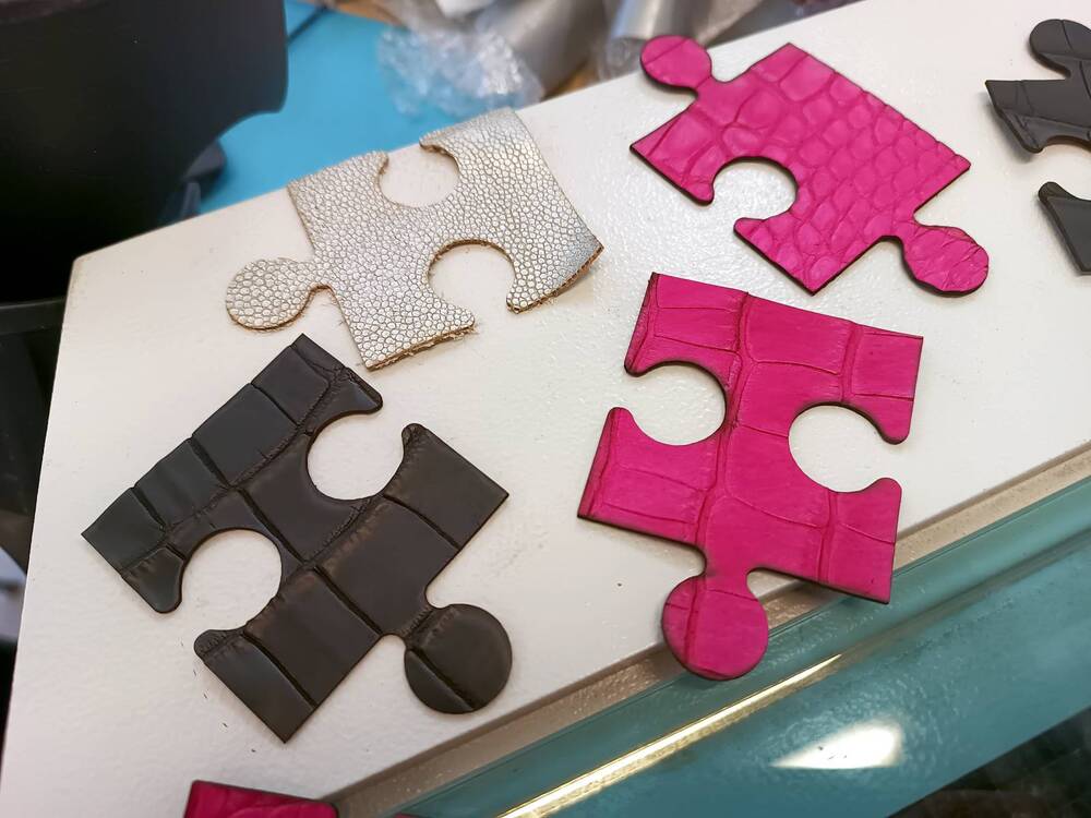 Pièces découpées au laser dans toutes sortes de cuirs récupérés.
