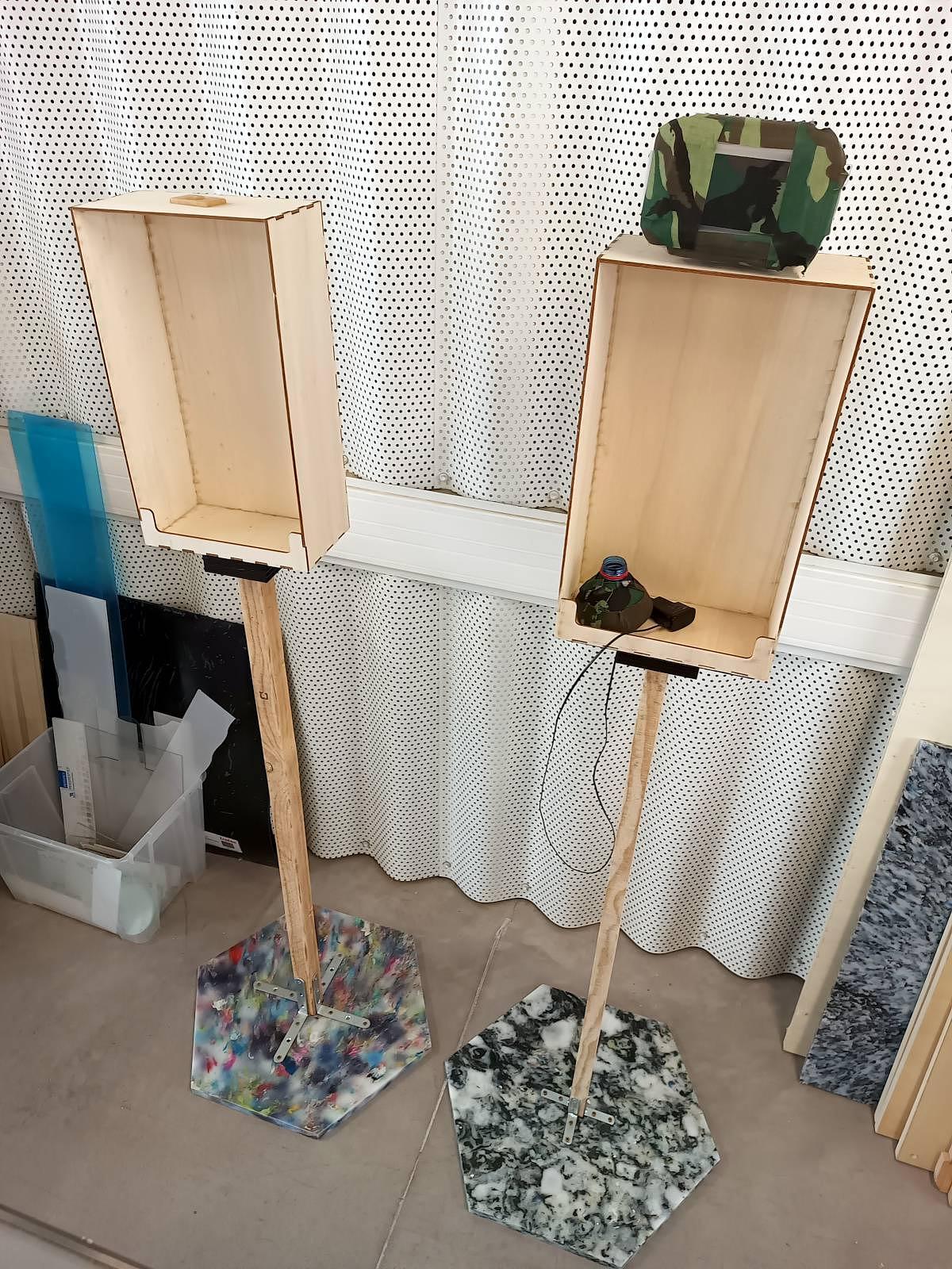 Des boites filmant une zone de jet de dés (réutilisation des caméra biodiversité), pour une grande expérience de recherche participative. Avec des bases bien massives en grande planche de plastique recyclé.