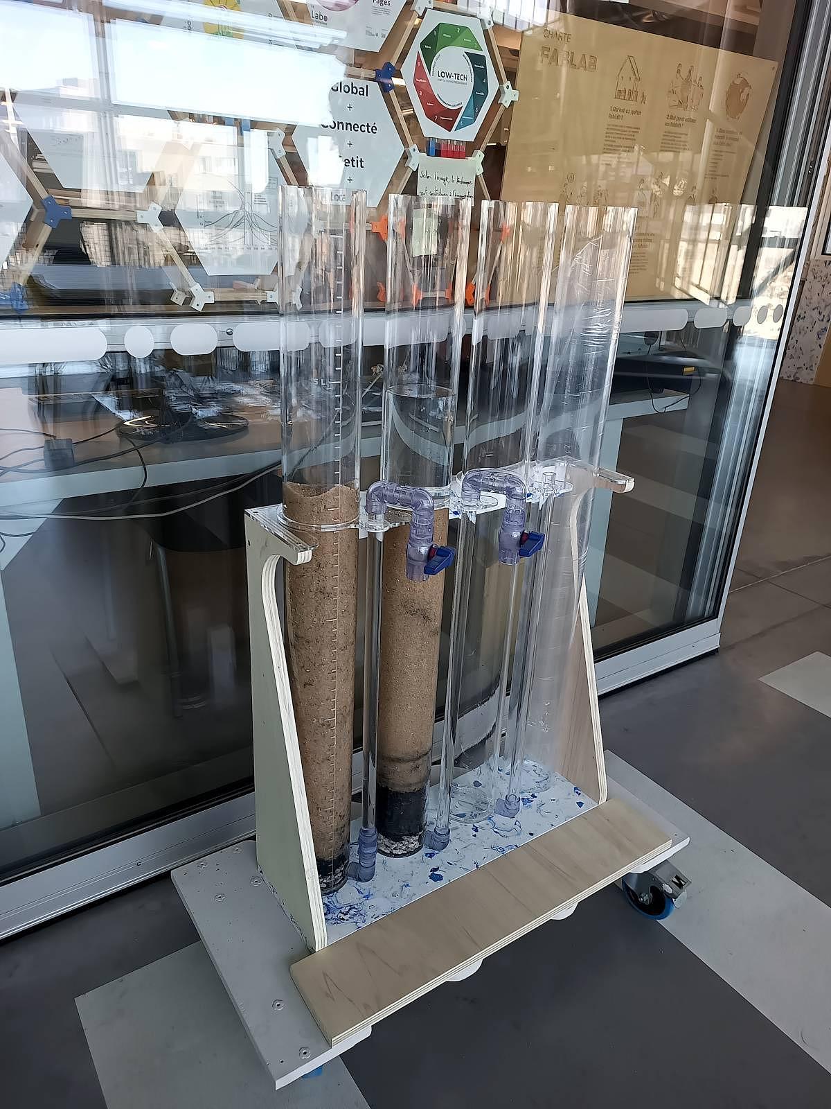 Pour un atelier sur le biochar et ses étonnantes propriétés, on a fabriqué un grand porte-tube et préparé de quoi fabriquer 4 tubes en acrylique pour voir les matières filtrantes en action.