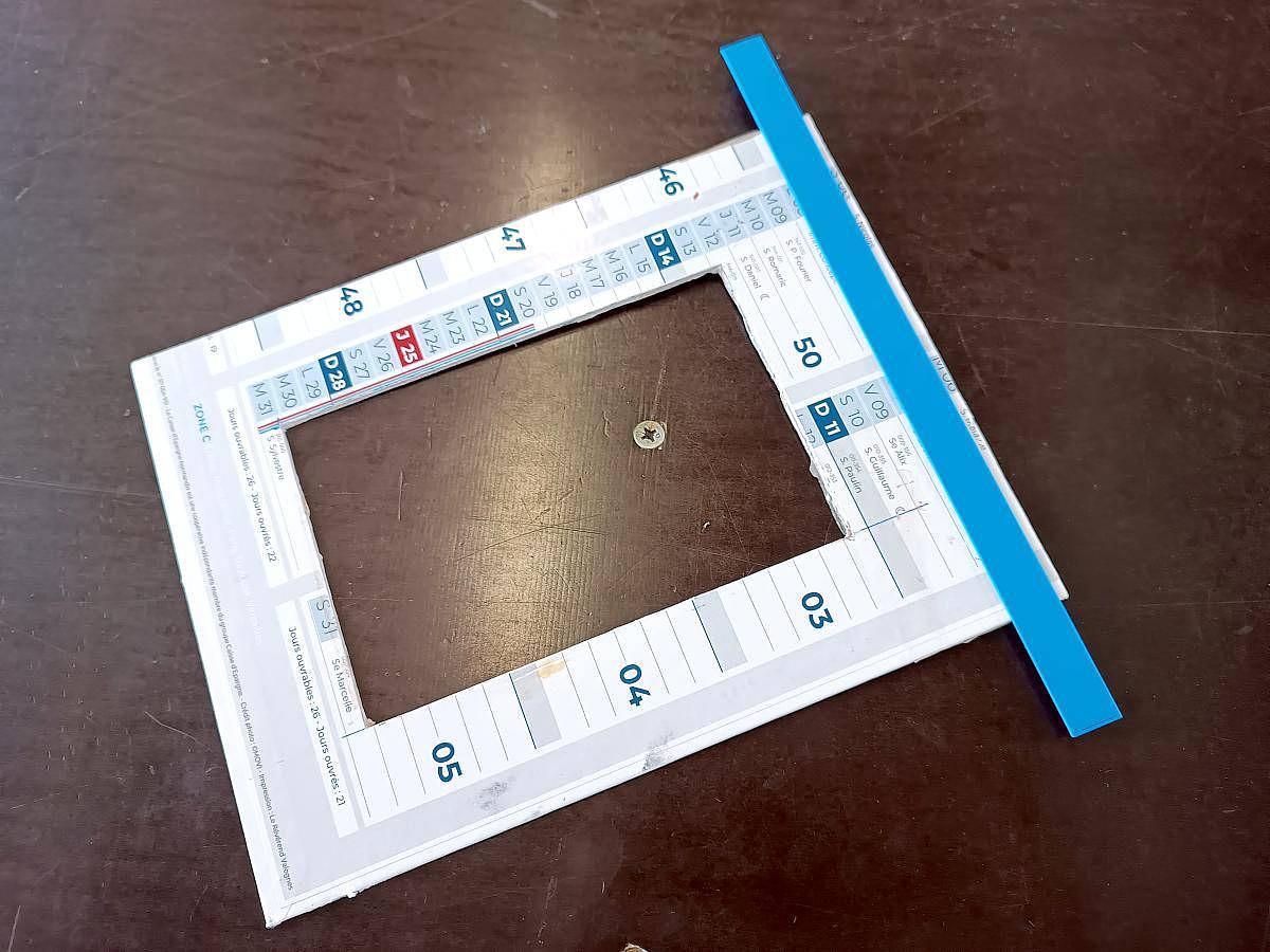 Elle découvre l'atelier et vient voir s'il on peut l'aider à améliorer son cadre qui tient la feuille de papier pendant l'encrage. Une rapide modélisation 3D sur la base de son plan aboutie à la baguette en plastique ci-dessus, qui s’emboîte dans son cadre en carton (heureusement du premier coup).