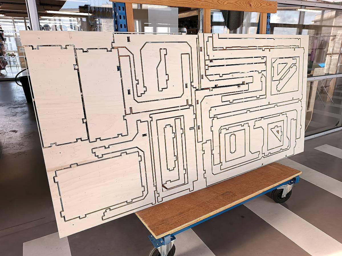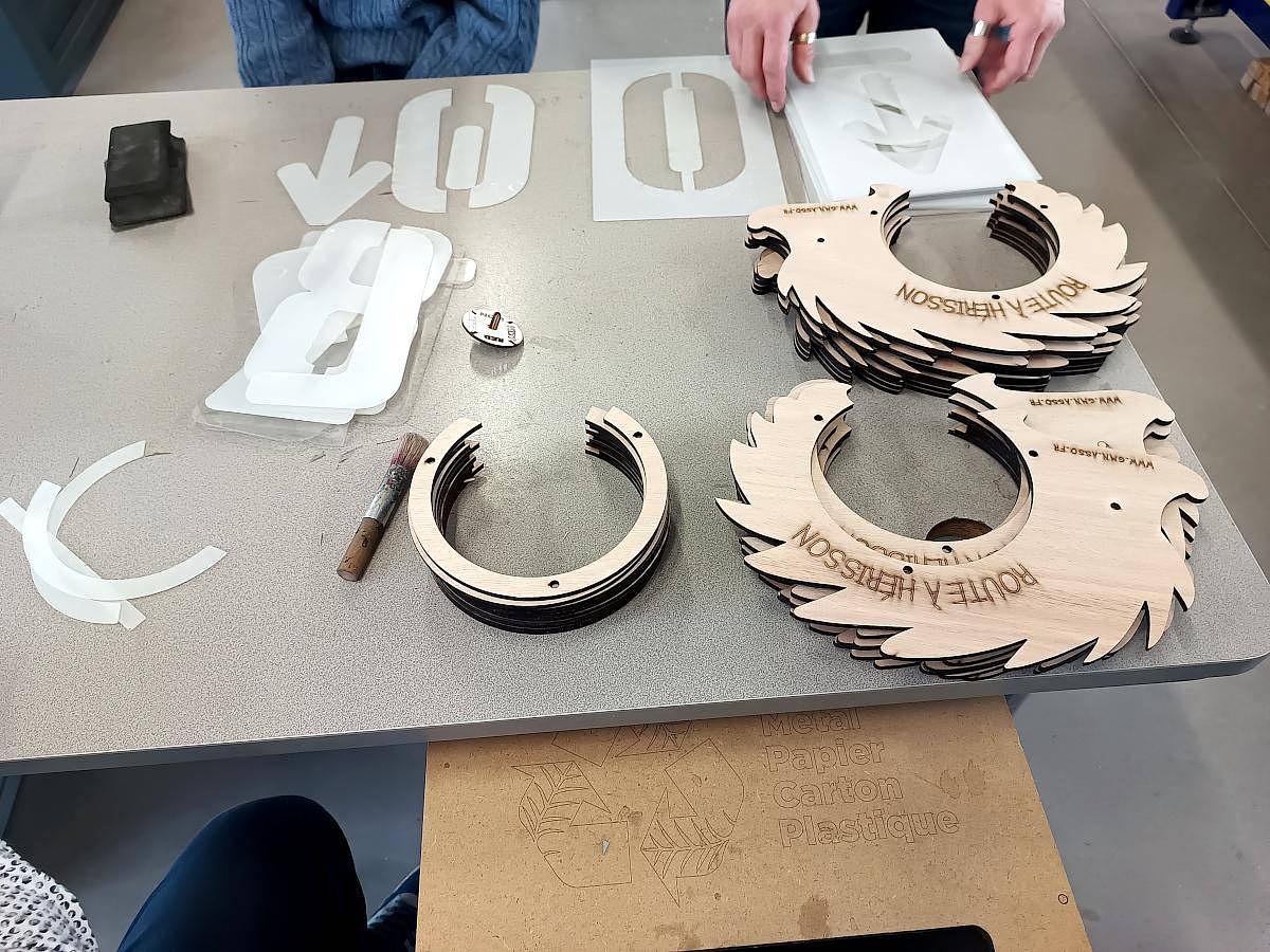 Ce bailleur social de la région nous avait approché pour réaliser ce fameux habillage en forme de hérisson pour équiper des jardin de certains de leur logement. Plutôt qu'une simple commande, l'accompagnement (via le DIHN) a permis de former une dizaine de personnes volontaires au logiciel libre Inkscape pour le dessin, ainsi qu'à la découpe laser. Très contents, ils même tout de suite pu transposer à d'autres besoins (ex. de pochoirs sur mesure pour refaire certains marquages au sol).