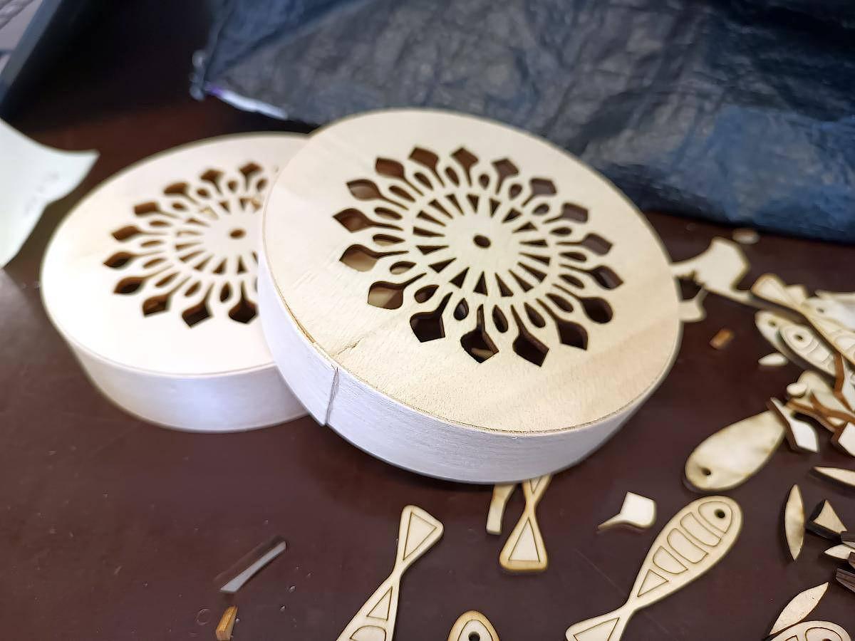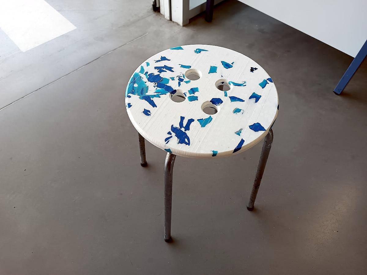 Un nouveau tabouret dans la collection aux plateaux en plastique recyclé, de la broderie sur doudoune, des boites de camembert découpée au laser, de petites réparations, des projets de couture et de costumes, etc.