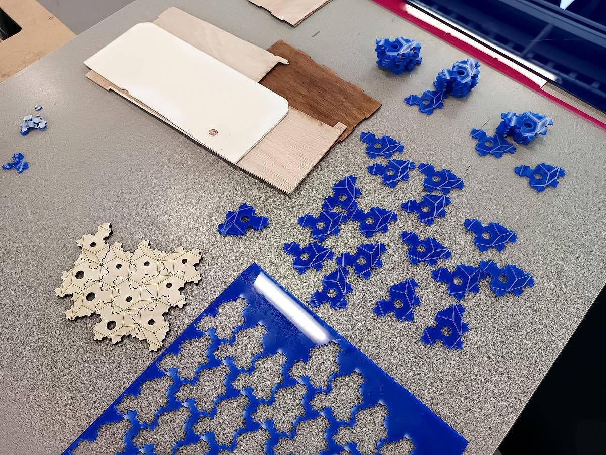 Une montagne de tuiles du fameux spectre, une planche de Galton (avec la grande fraiseuse), des modules de multiplications, et autres formes géométriques...
