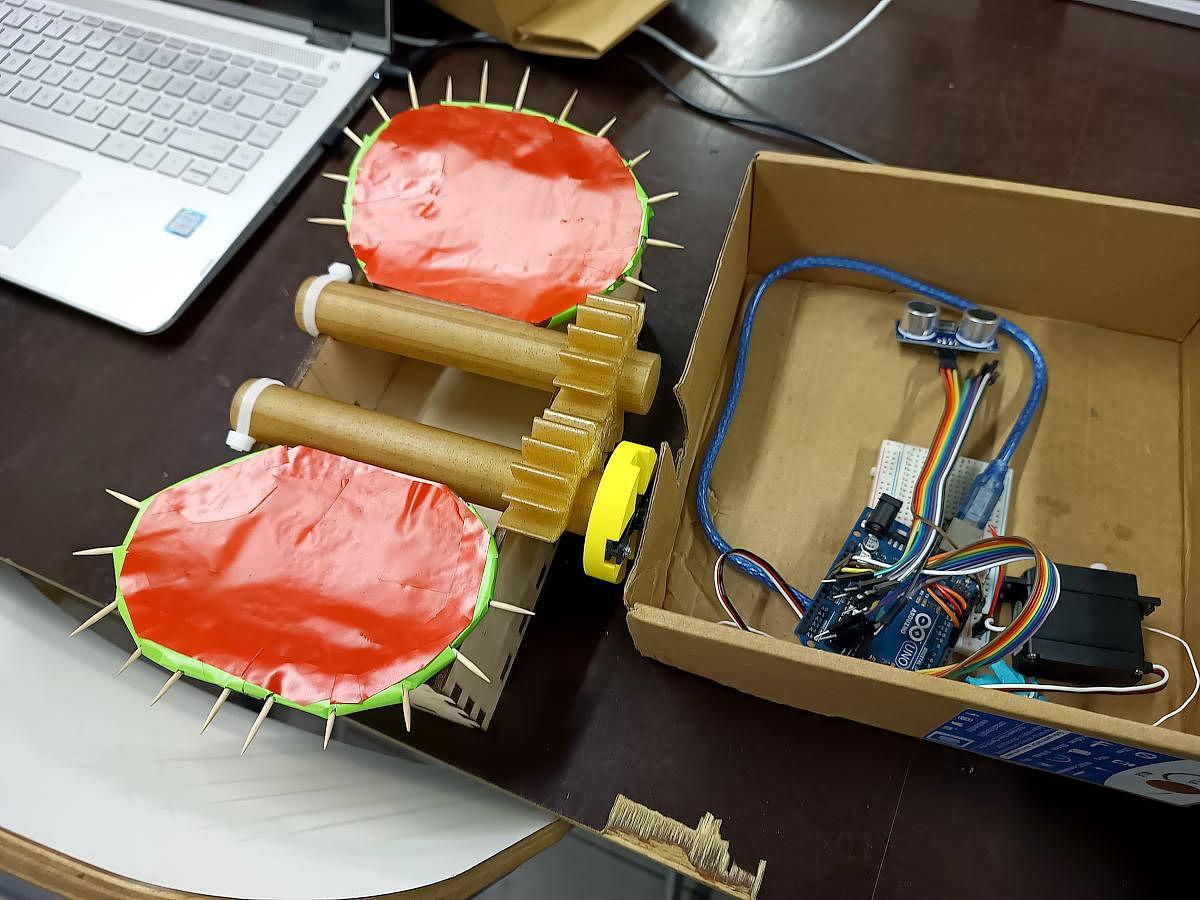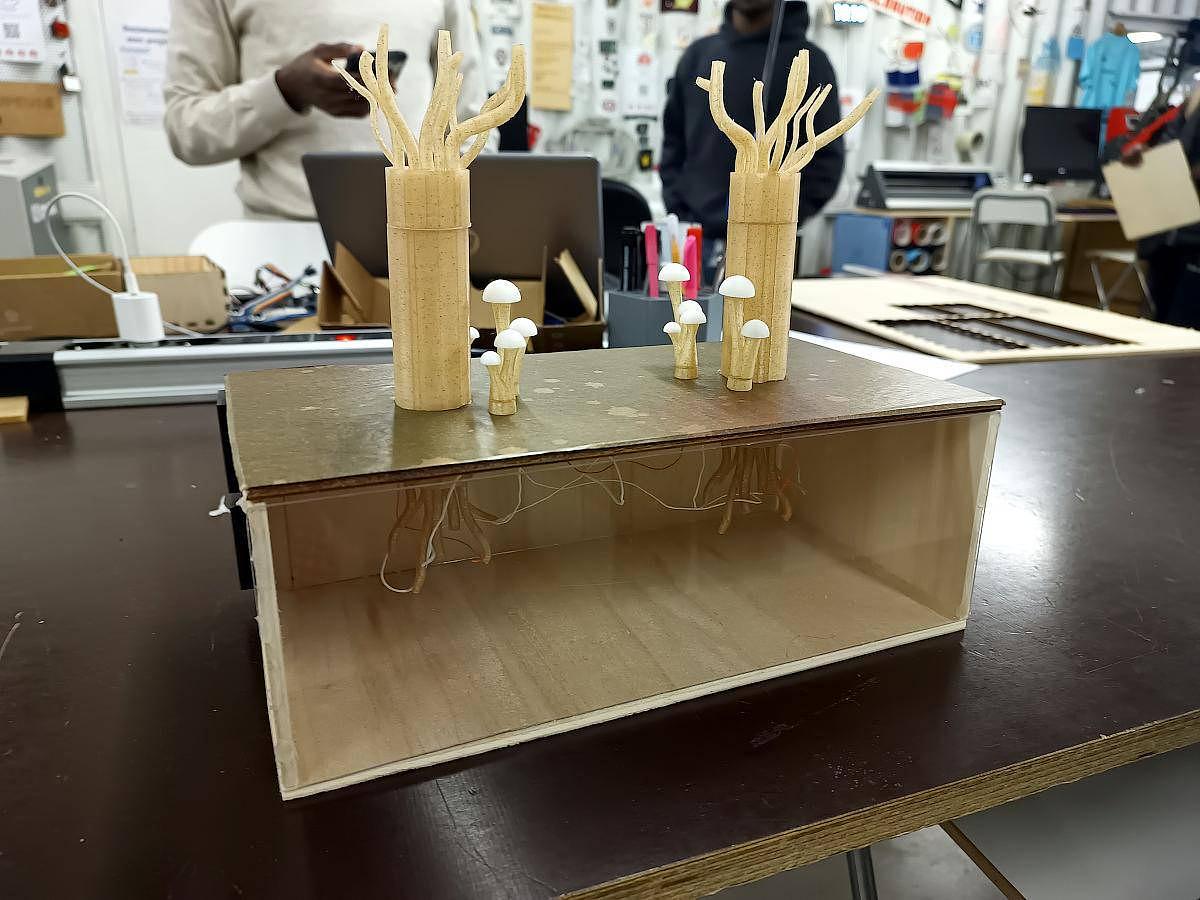 Au départ la consigne est simple : réaliser un objet sur un thème (explorer les intelligences) mais en combinant au moins 2 machines/procédés du FabLab. Cela donne de multiples maquettes plus ou moins ambitieuses vu les contraintes mais toujours sympathiques et originales. Telle que cette plante carnivore Dionaea Muscipula, un réseau de mycélium du Wood Wide Web, un labyrinthe, une fourmilière, et d'autres.