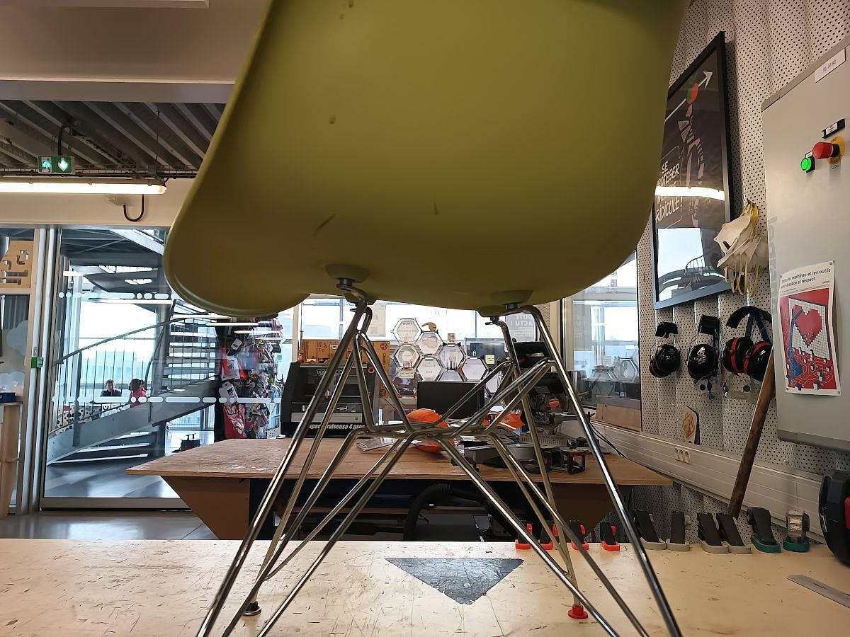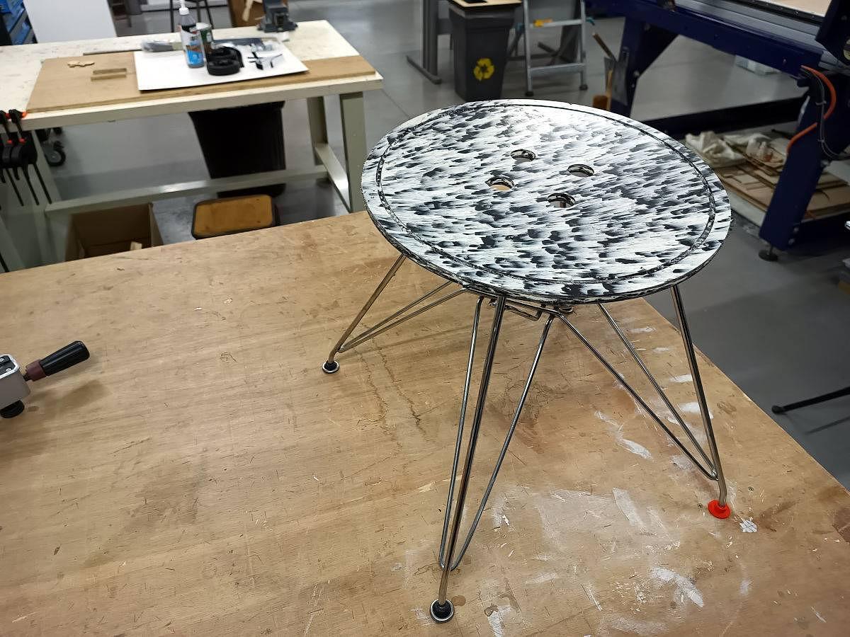 La coque en plastique d'une chaise avait fini par casser, mais c'était l'opportunité de conserver son piétement en métal, et de remplacer l'assise par cette sorte de gigantesque bouton, en guise de tabouret.