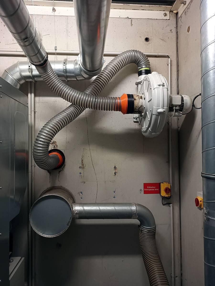 Dans un local que vous ne verrez probablement jamais... La tuyauterie par laquelle s'évacuent les fumées de la grande laser n'avait pas vraiment été prévue pour être démontable... Après plusieurs années à y penser un peu lors de la maintenance (tout les 2 mois environ), j'ai fini par remplacer des sections de tube rigide par du tube souple prévue pour ce type d'application (et quelques raccords imprimés sur-mesure). De quoi grandement se faciliter la vie et éliminer des réductions de diamètres inutiles.