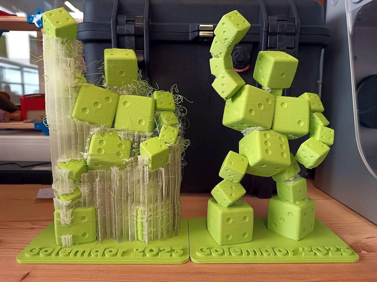 Le golem de l'association Jouons Ensembles fut un bon défit pour l'imprimante 3D (à gauche avec support soluble, à droite quasiment tout nettoyé). Quand la ville est revenu faire du marquage laser (avec du ruban de Cermark) sur des ustensiles de cuisine cette année encore pour le Croq'festival (l'an dernier c'était des pelles à tarte).