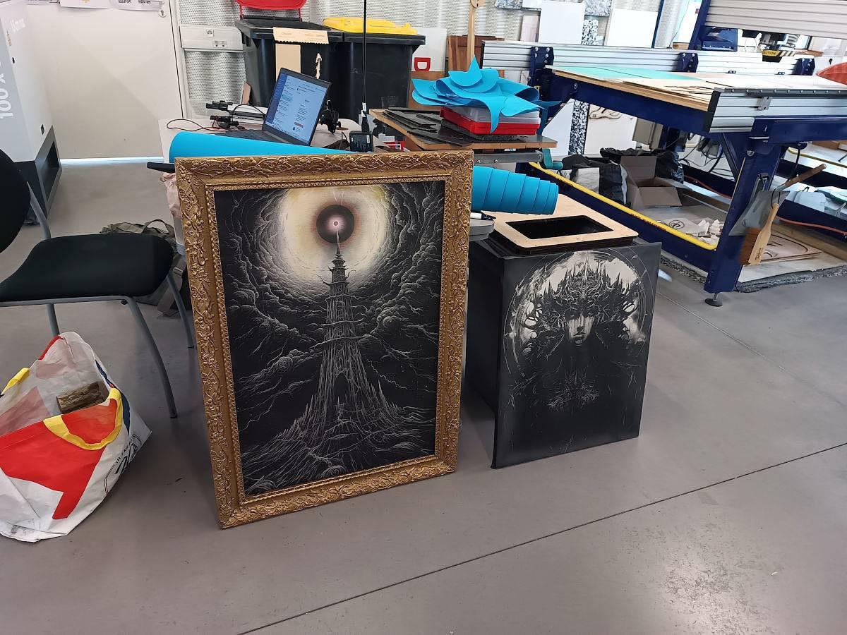 Réparation d'une brosse de piscine, fabrication de filament pour imprimante 3D, découpe d'un passage à hérisson, diverses broderies, des accessoires de théâtre (où l'on en profite pour rappeler qu'on peut déjà bricoler pas mal de choses avec juste du carton et un cutter), des pièces de costume en mousse, et quelques chouettes gravures sur toile.
