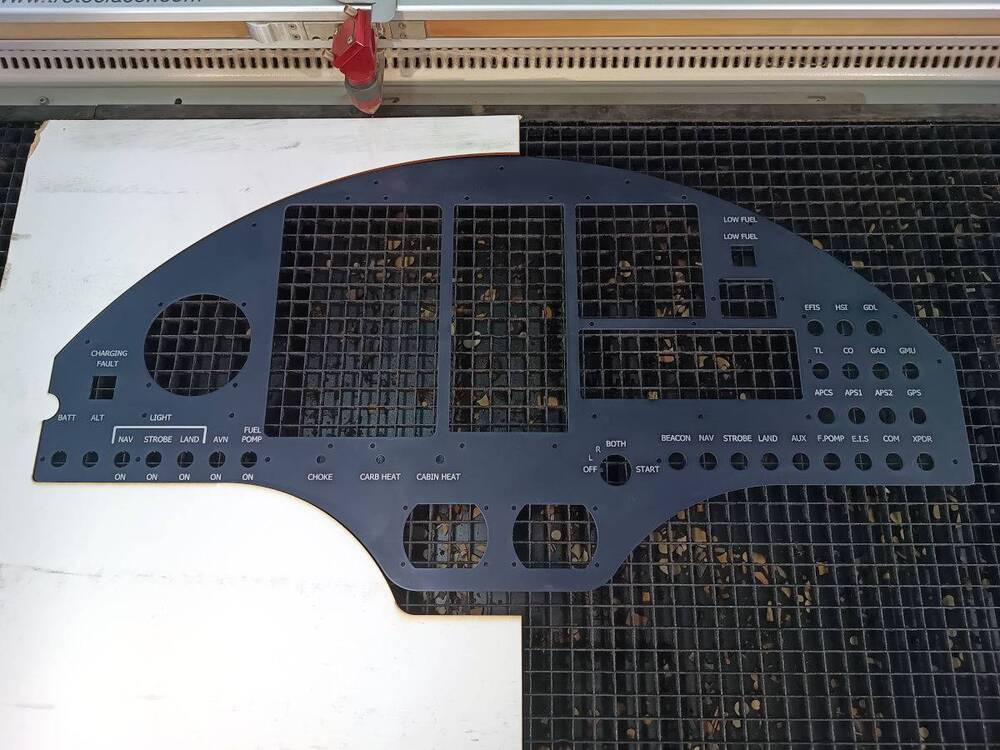 Un passionné fabriquant dans son garage un avion monoplace (!), avait besoin de graver le tableau de bord de son futur cockpit (ici en aluminium anodisé noir). Bon exercice de positionnement également (le gabarit aide).