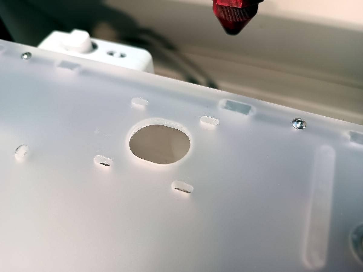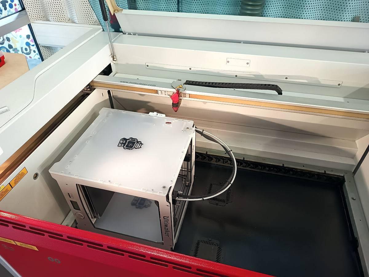 Pour une fois la profondeur de travail de la Speedy 400 est utilisée au maximum : l'imprimante 3D rentre telle quelle ! Le but était de légèrement déplacer vers l'extérieure une poulie et pour ça il fallait pratiquer une ouverture sur le flanc en plastique (bon exercice de positionnement aussi pour se caler sur le trou oblong existant).
