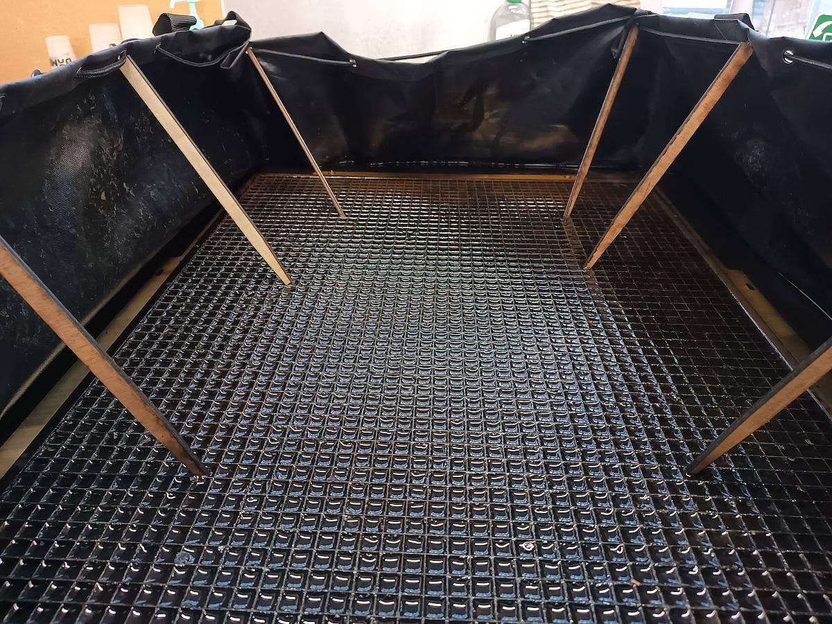 Une fois l'an c'est bien de nettoyer un peu les grilles des lasers... Dans un sac à gibier (Décathlon), rare bâche étanche du bon format, avec des tiges pour tenir la toile et l'empêcher de retomber (façon piscine auto-portée). Un robinet dans un coin permet également de vider l'eau dans un évier proche. Tout ça permettant de consommer bien moins d'eau comparé à un passage au karcher d'une demi-journée.