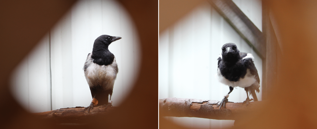 Deux Pies bavardes partageant la même volière en attendant d’être relâchées.