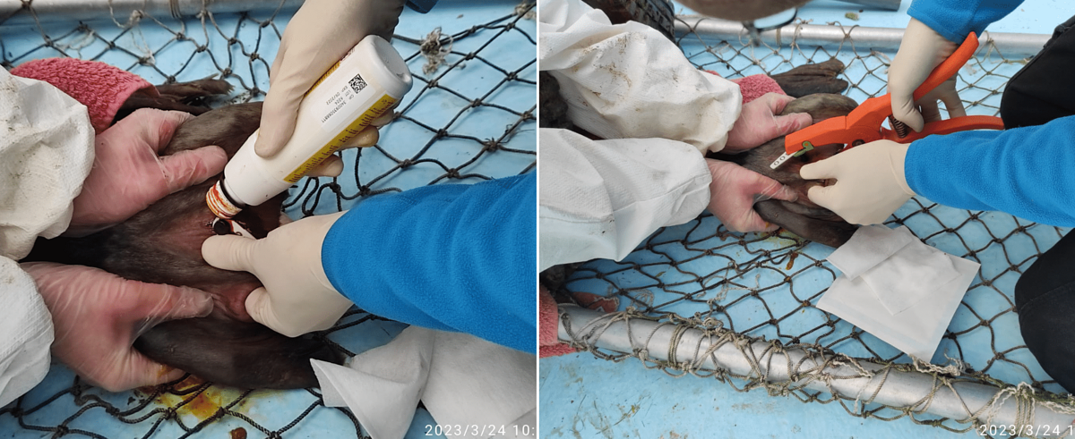 Il est rare, au CHENE, de relâcher des animaux bagués. Ceux qui n’échappent pas à la règle sont les phoques ! Chaque phoque gris et veau-marin accueilli au centre est bouclé au niveau de la palmure, avec un numéro d’identification. Cette opération s’effectue au moment de son passage de la quarantaine à la piscine. Il conservera cette bague toute sa vie. De cette façon, il est possible de retracer leur historique, s’ils sont repris par un autre centre de soins par exemple, ou de les identifier s’ils sont observés dans la nature.