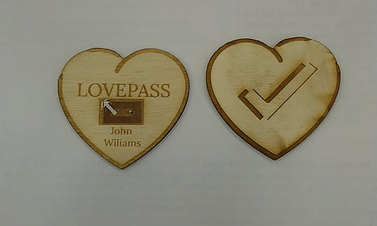 Au 3ème jour nous avons réalisé le design ainsi que la création de notre LovePass, un badge NFC en bois découpé et gravé sur place au fablab (voir ci-contre). Nous avons défini les données que l’on rentre sur ce badge pour que l’on accède au profil LovePass du possesseur et ainsi savoir s'il a réalisé un dépistage récent. Nous avons aussi réalisé la génération des QR Codes pour notre application. Nous avons aussi réussi à faire le lien entre le frontend et le backend en local et héberger nos pages de présentation sur notre serveur.