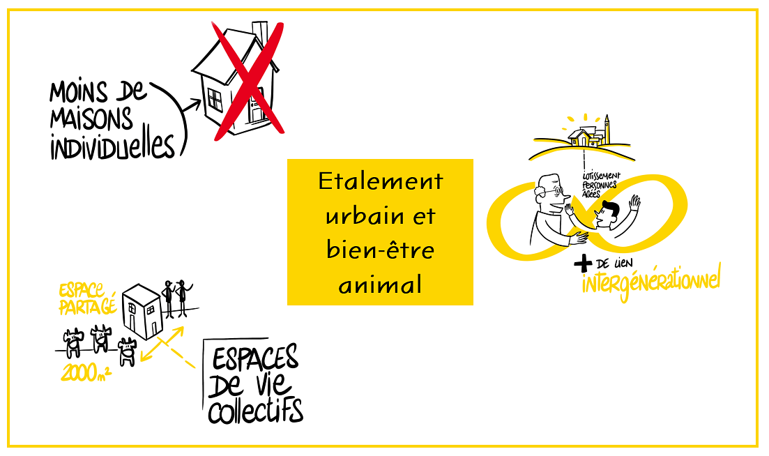 Selon certains participants, l'amélioration du bien-être animal passe par une modification de nos modes de vie. En évoluant, la société s'est davantage individualisée. Beaucoup de personnes vivent seules dans des maisons individuelles, les liens intergénérationnels ont eu tendance à s'éloigner. Et si nous revenions en arrière, c'est-à dire, si nous vivions à nouveau dans des espaces collectifs, dans des maisons où plusieurs générations cohabitent sous le même toît ? Cela permettrait de conserver plus d'espace pour l'agriculture et pour les animaux, mais aussi d'avoir plus de connexions entre les habitants.