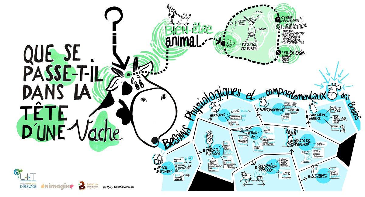 Les besoins physiologiques et comportementaux des vaches en tête, les participants ont été invités à passer à la phase créative. Durant trente minutes ils ont pu mettre en avant toutes les idées qui permettraient, à l'échelle du citoyen/consommateur d'améliorer la santé et le bien-être des animaux d'élevage.